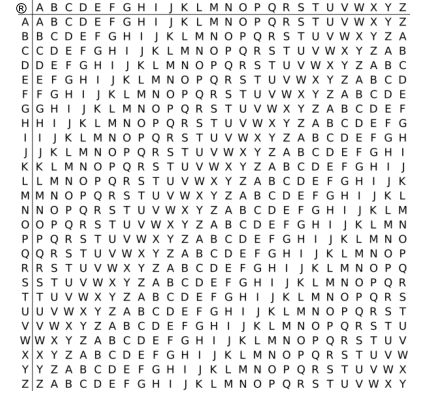 在密码学中,我们称需要加密的信息为明文,用 M 表示;称加密后的信息为密文,用C 表示;而密钥是一种参数,是将明文转换为密文或将密文转换为明文的算法中输入的数据,记为 k。在 Vigenère 密码中,密钥 k 是一个字母串,k=k1k2…kn。当明文 M=m1m2…mn时,得到的密文 C=c1c2…cn,其中 ci=mi®ki,运算®的规则如下表所示: