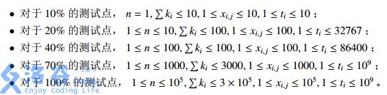接下来n行,每行描述一艘船的信息:前两个整数ti和ki分别表示这艘船到达海港的时间和船上的乘客数量,接下来ki个整数x(i,j)表示船上乘客的国籍。